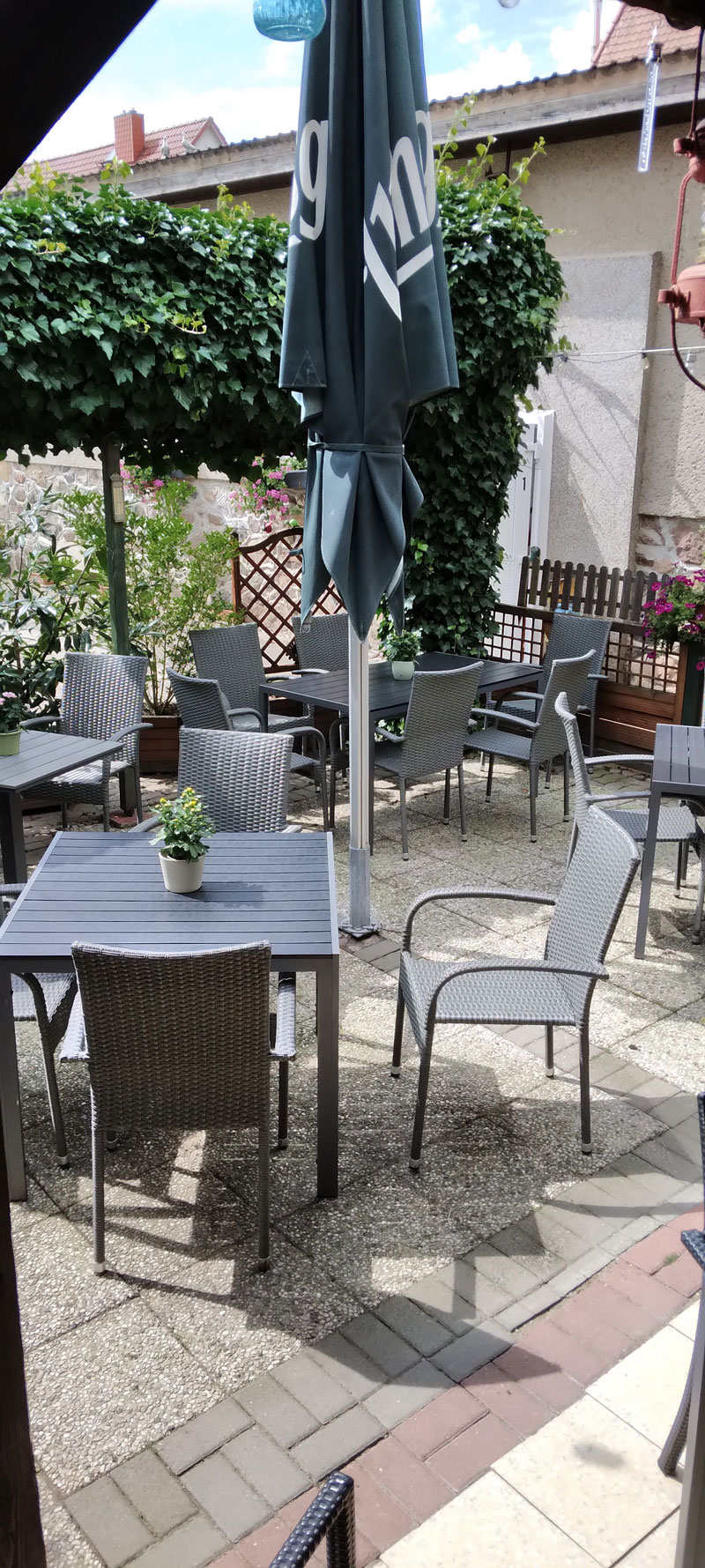 An sonnigen Tagen lockt unsere hofseitige Terrasse mit duftenden Blumen und lauschigen Ecken zum Verweilen bei einem kühlen Getränk. Für festliche Anlässe bis 40 Personen arrangieren wir nach Wunsch individuelle Menüs und Dekoration.